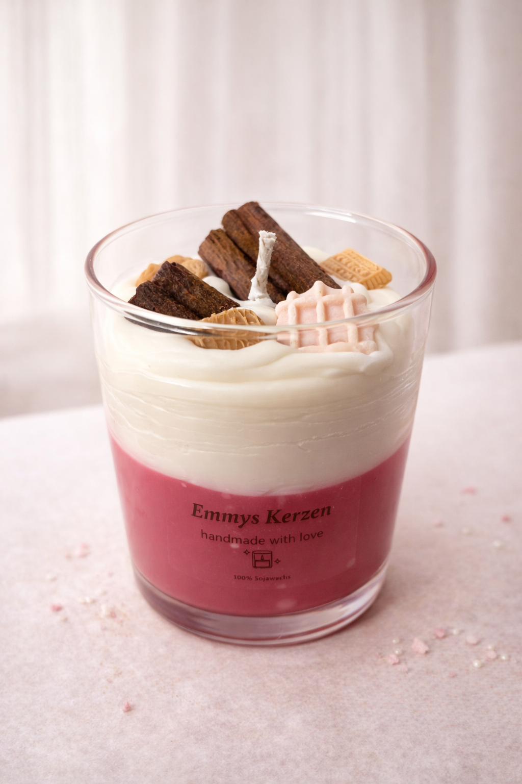 - Design: Dessert-Optik im Glas mit dekorativen Wachselementen
