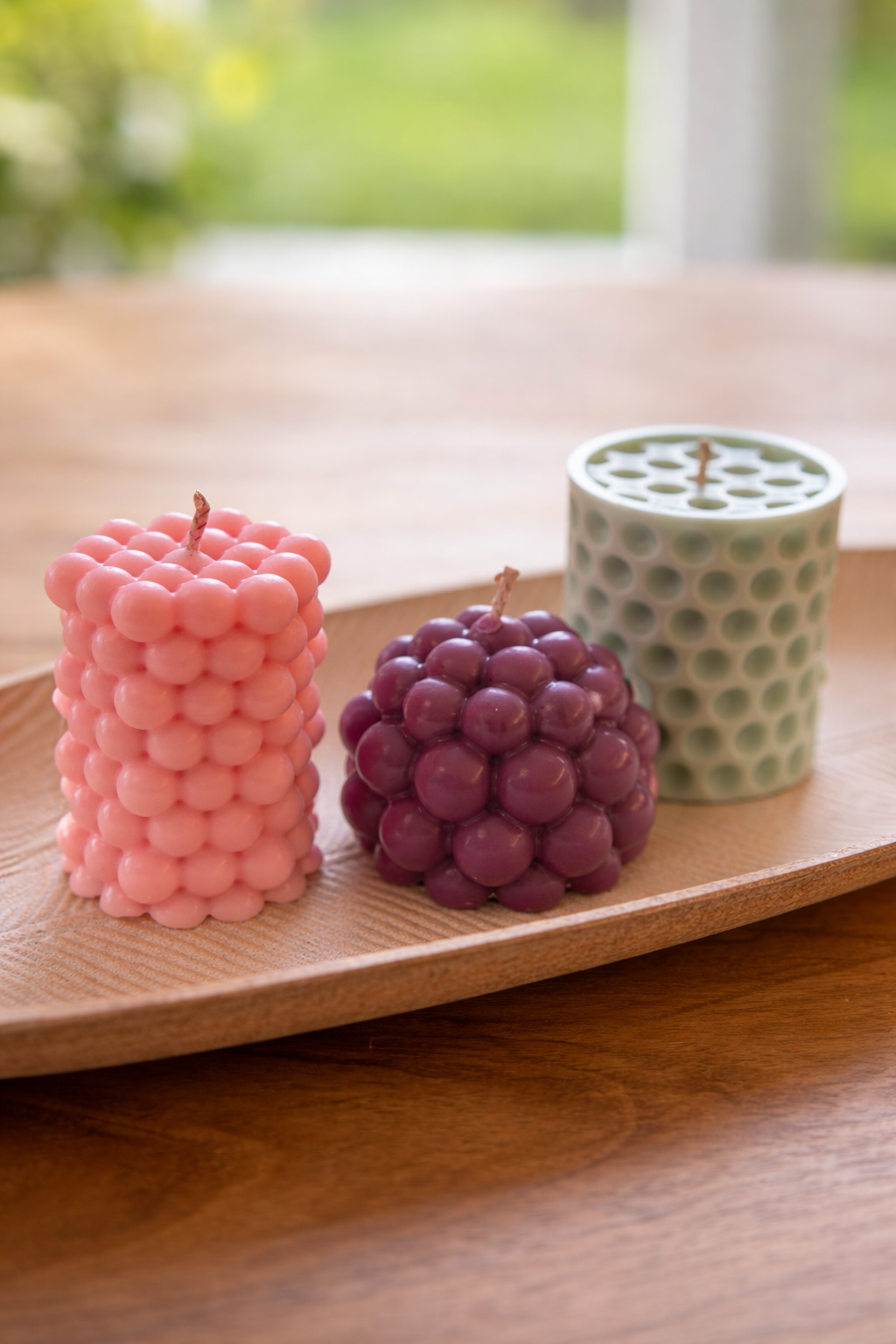 Das stilvolle Bubble Kerzen Set von Emmys Kerzen besteht aus drei kleinen dekorativen Kerzen in modernen Farben. Die besondere Bubble Struktur mit runden Kugeln macht jede Kerze zu einem echten Blickfang in deinem Zuhause.