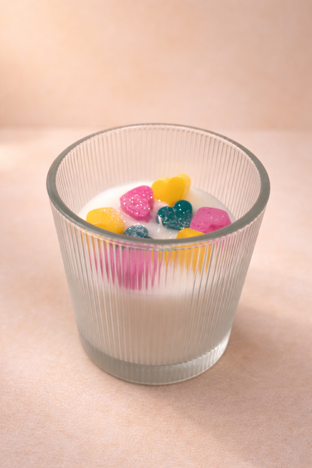 Die Oberfläche ist mit bunten Herzchen aus Wachs dekoriert – in Pink, Gelb und Türkis, veredelt mit einem zarten Glitzereffekt.