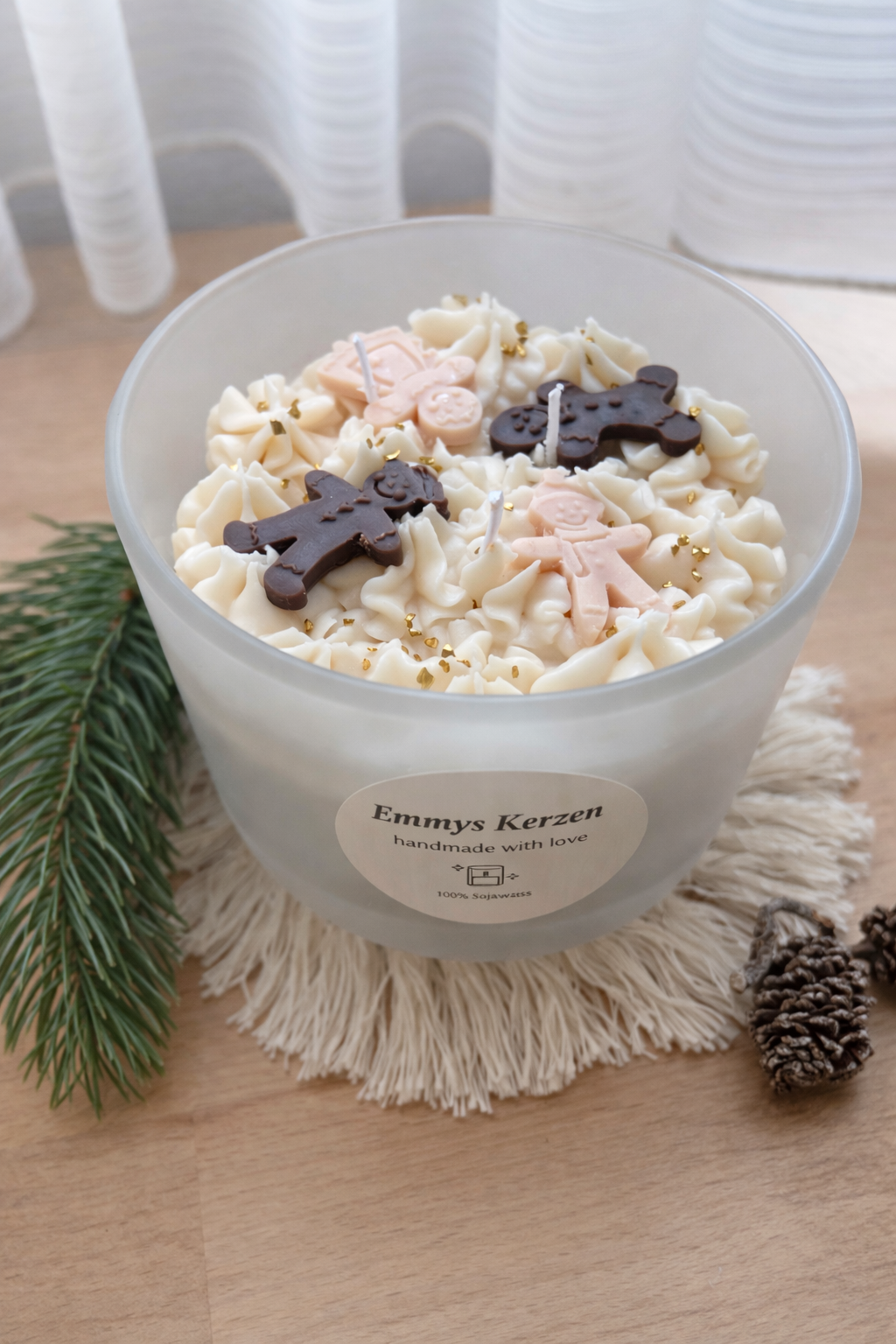 Diese liebevoll handgegossene Lebkuchen Family Duftkerze ist ein kleines Stück Weihnachtszauber für dein Zuhause. Hergestellt aus 100 % natürlichem Sojawachs und dekoriert mit kleinen Lebkuchenfiguren, erinnert sie an frisch gebackene Kekse, warme Lichterketten und ruhige Adventabende. Der sanfte Lebkuchenduft erfüllt den Raum mit einer warmen, süßen Note – angenehm, nicht aufdringlich.