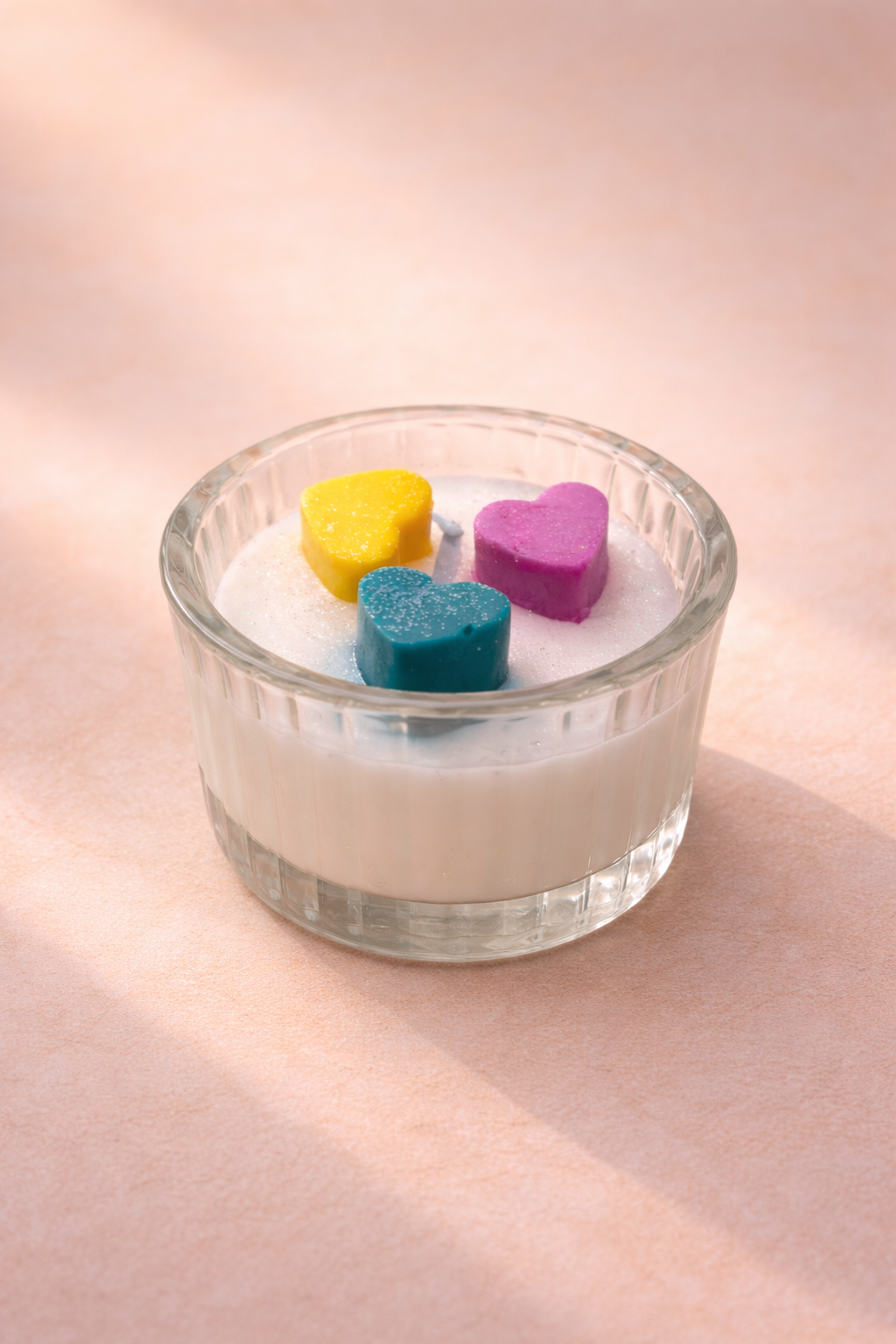 In zartem Glas gegossen und mit farbenfrohen Wachs-Herzchen in Pink, Gelb und Türkis verziert, bringt es sofort gute Laune und ein wenig Glitzer in dein Zuhause.
