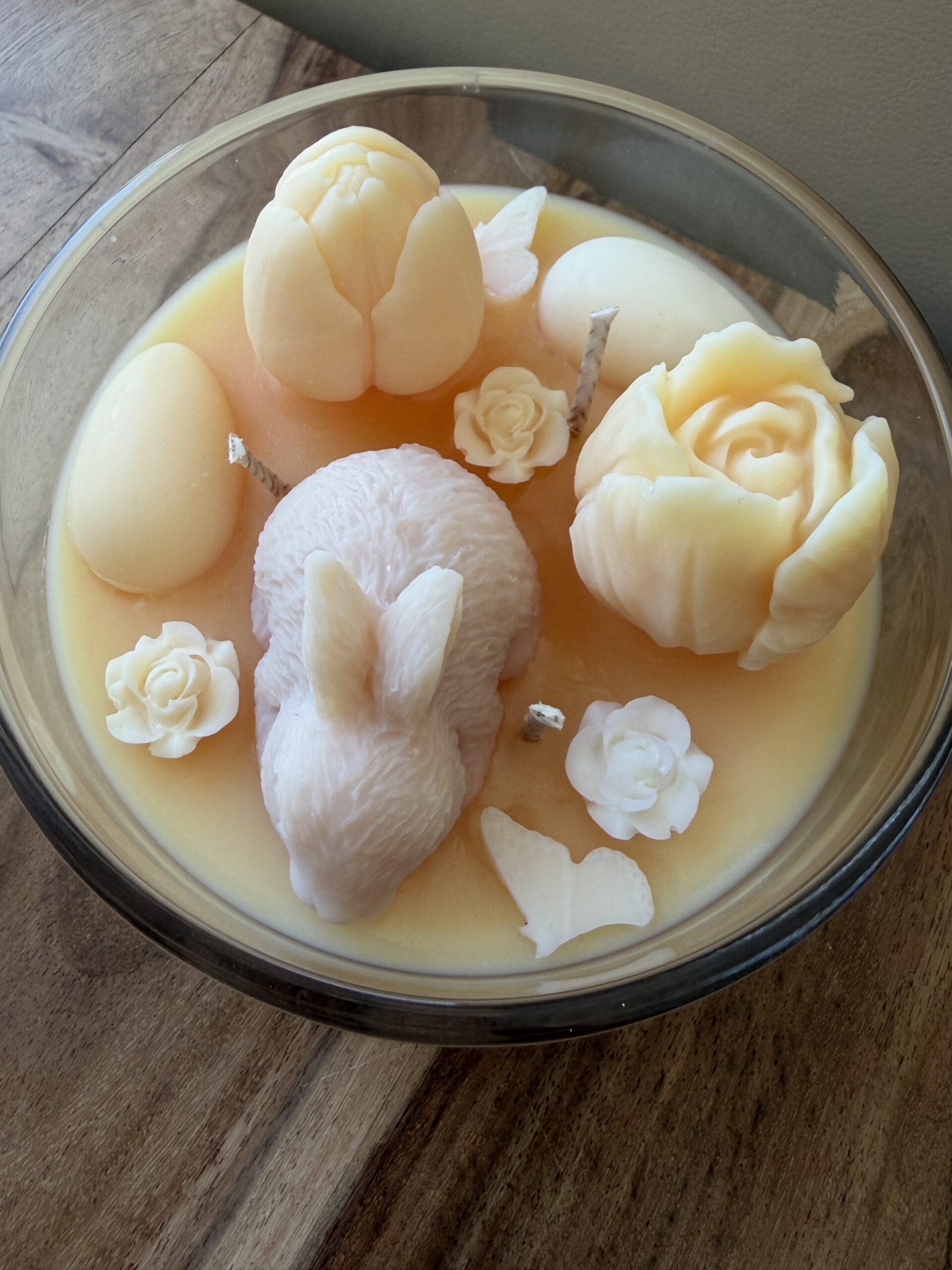 Die Kerze verbindet Frühlingsstimmung, Eleganz und liebevolle Handarbeit und passt perfekt zu jeder Osterdekoration.