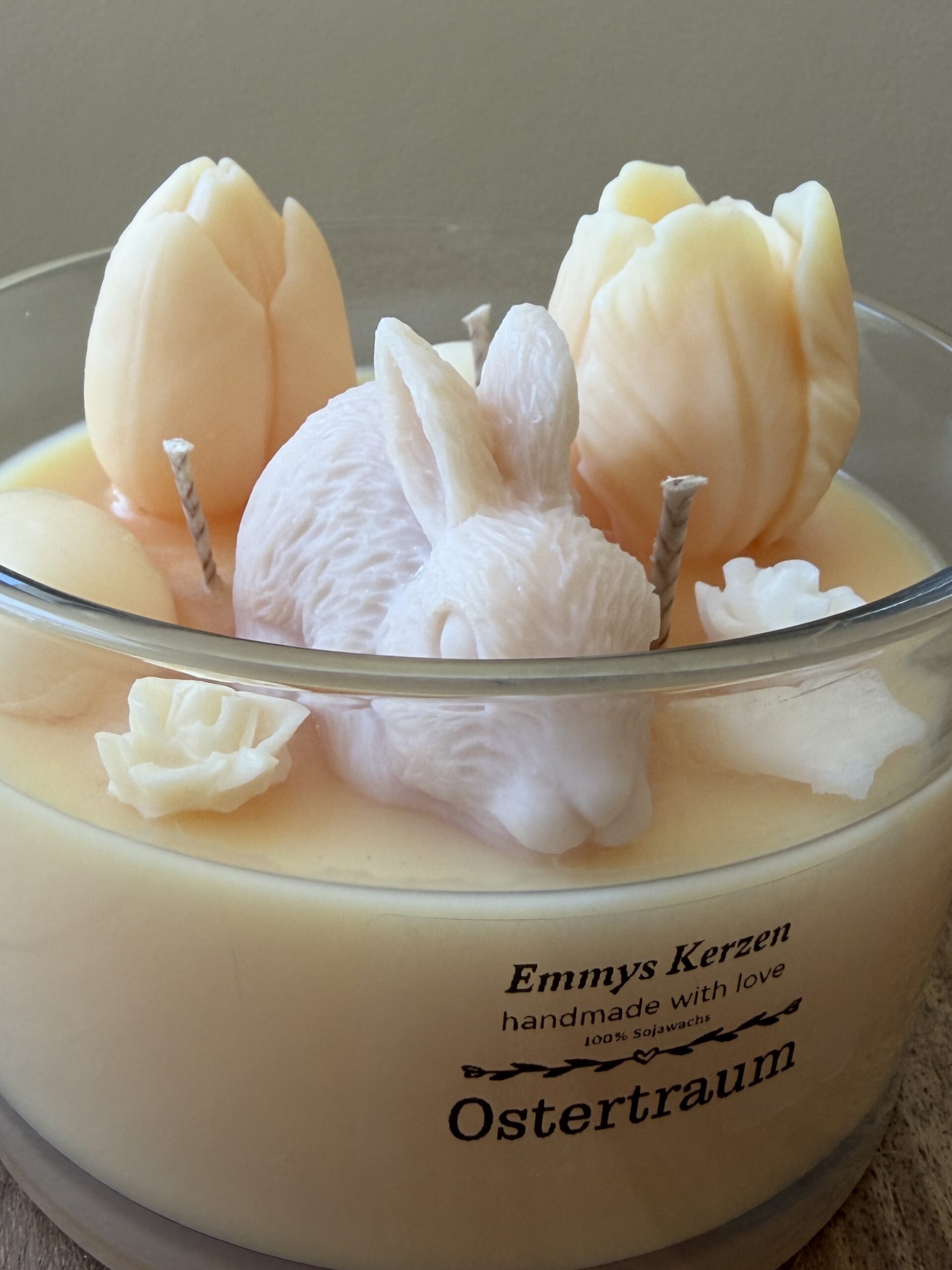 Die Kerze Ostertraum von Emmys Kerzen ist eine wunderschöne handgemachte Osterkerze aus hochwertigem Sojawachs.