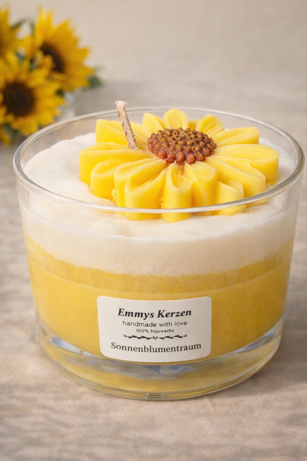 Die Sonnenblumentraum – Kerze mit sommerlichem Design von Emmys Kerzen ist eine besondere handgemachte Kerze aus hochwertigem Sojawachs.